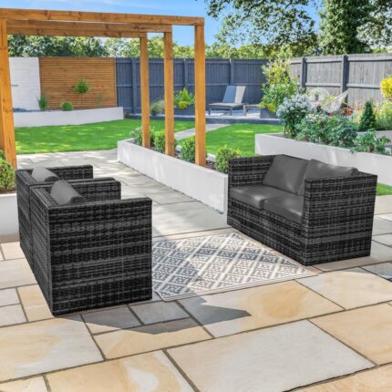 Harrier 4 Seater Rattan Furniture Set – Outdoor Patio Sofa with Optional Ottoman, Coffee Table – Grey/Black & Grey