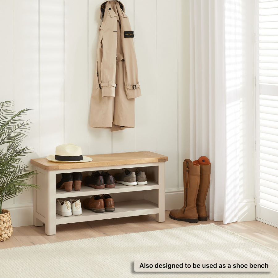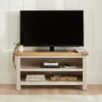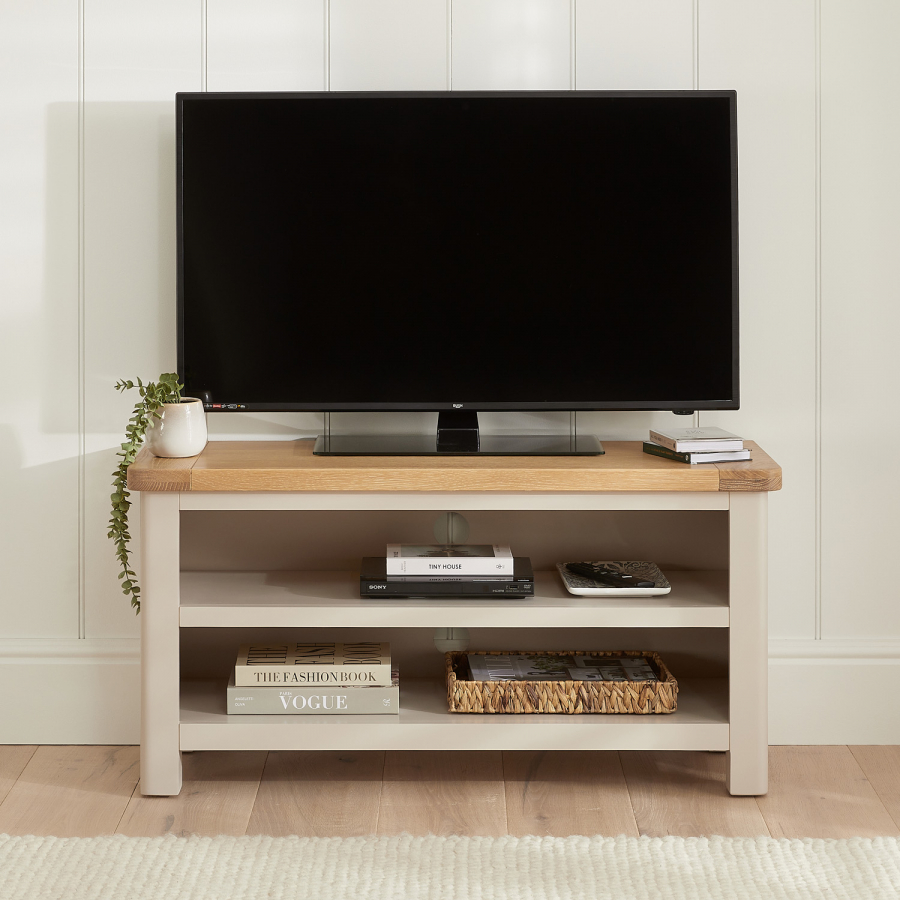 The Marbury TV unit features a putty grey painted body with a satin finish, paired with a natural oak top finished with a light whitewash that beautifully highlights the oak grain.